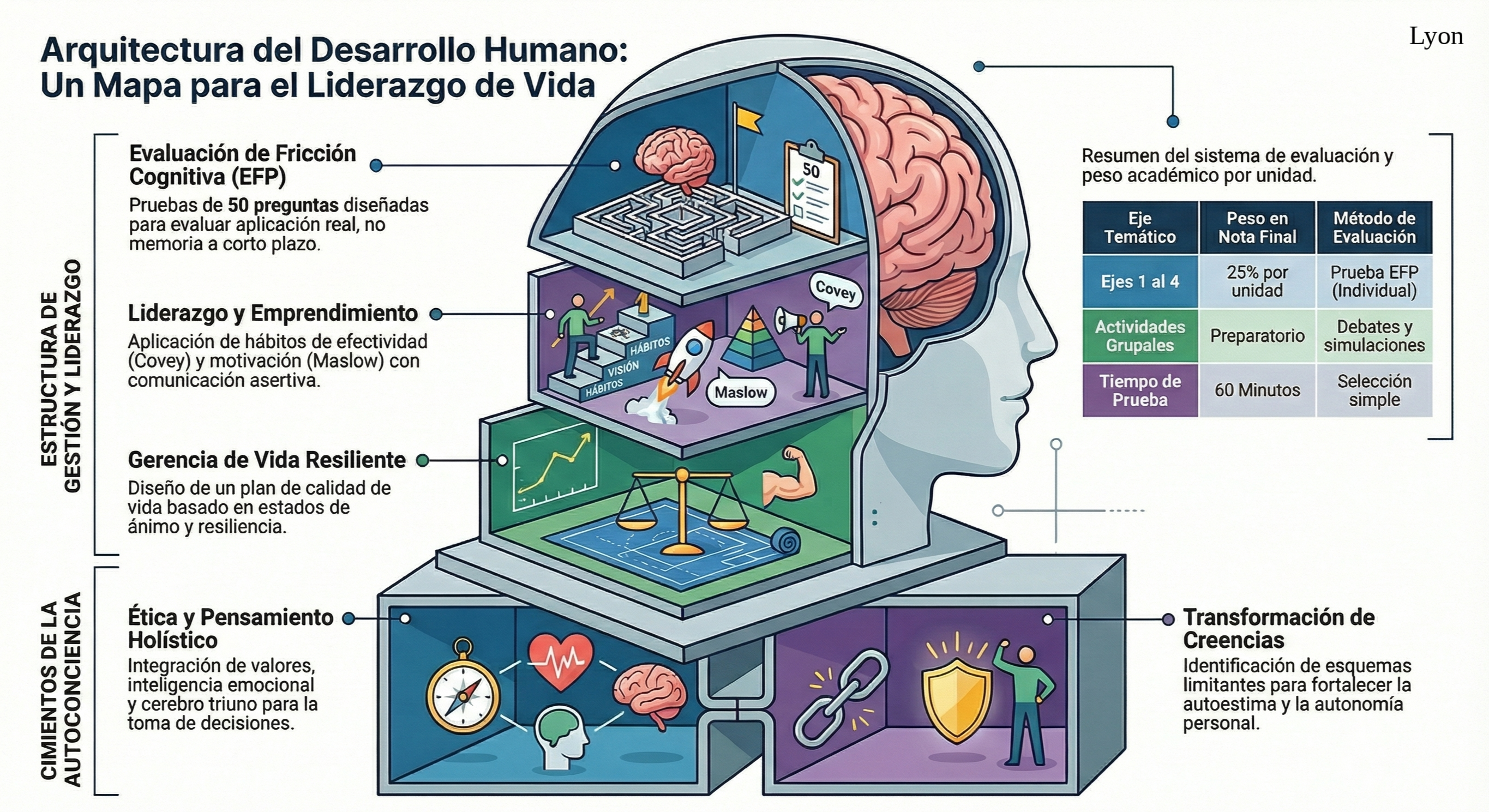 Que los estudiantes desarrollen una comprensión profunda e integrada del desarrollo humano, reconociendo la influencia de sus creencias, emociones y valores en su proyecto de vida, y adquieran herramientas prácticas para liderar su propio crecimiento y relacionarse asertivamente con los demás.